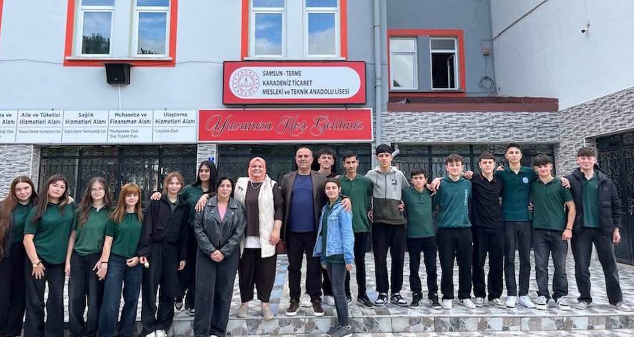 Samsun Terme’deki Karadeniz Ticaret Mesleki ve Teknik Anadolu Lisesi’nde öğrencileri okul bahçesinde toplayan müdür yardımcısı Savaş Bozkurt, İstiklal Marşı töreninde…