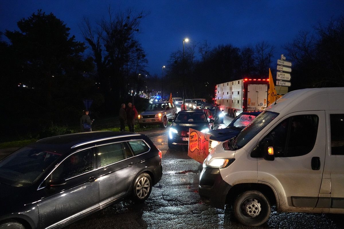 Fransa’nın Saone-et-Loire vilayetine bağlı Macon kentinde çiftçiler, ülke genelinde süren tarım protestoları kapsamında ana ulaşım güzergâhlarında eylem yaptı. Göstericiler, traktörlerle ve çeşitli araçlarla ulusal yolu kapatarak çift yönlü trafiği durdurdu.