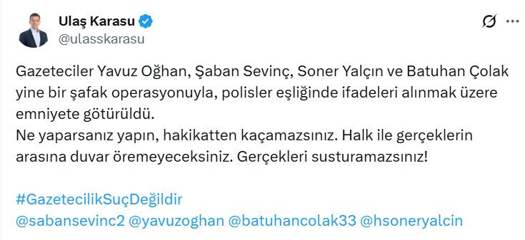 Gazetecilere yönelik yapılan operasyona siyasetçilerden de peş peşe tepkiler geldi. CHP Genel Başkanı Özgür Özel, “Her sabah bir korkuya gark etmeye çalışıyorlar. Ama taktik bu; umudu örgütleyemeyenler, sevgiyi büyütemeyenler korkuyu örgütlemeyi, tehdidi büyütmeyi kendilerine yol seçmişler. Bu sabah kalktık gazeteci arkadaşlarımız, dünya kadar gazeteci yine gözaltına alınmış. Her sabah bir korkuya gark etmeye çalışıyorlar. Ama taktik bu; umudu örgütleyemeyenler, sevgiyi büyütemeyenler korkuyu örgütlemeyi, tehdidi büyütmeyi kendilerine yol seçmişler. Böyle kalabileceklerini düşünüyorlar iktidarda. Oysa ki karanlığın panzehiri yanan bir tek ışıktır. Günün en karanlık zamanı, sabahın en yakın olduğu zamandır. Hiçbir zaman sonunda kötüler kazanmaz. Kötüler kaybeder iyiler kazanır. Gece kazanmaz, güneş doğar gündüz kazanır. Karanlık yerine aydınlık kazanır, hurafe yerine bilim kazanır. Tembele karşı çalışkan kazanır, korkağa karşı cesur olanlar kazanır. Ben hepinize inanıyorum ve güveniyorum” dedi.