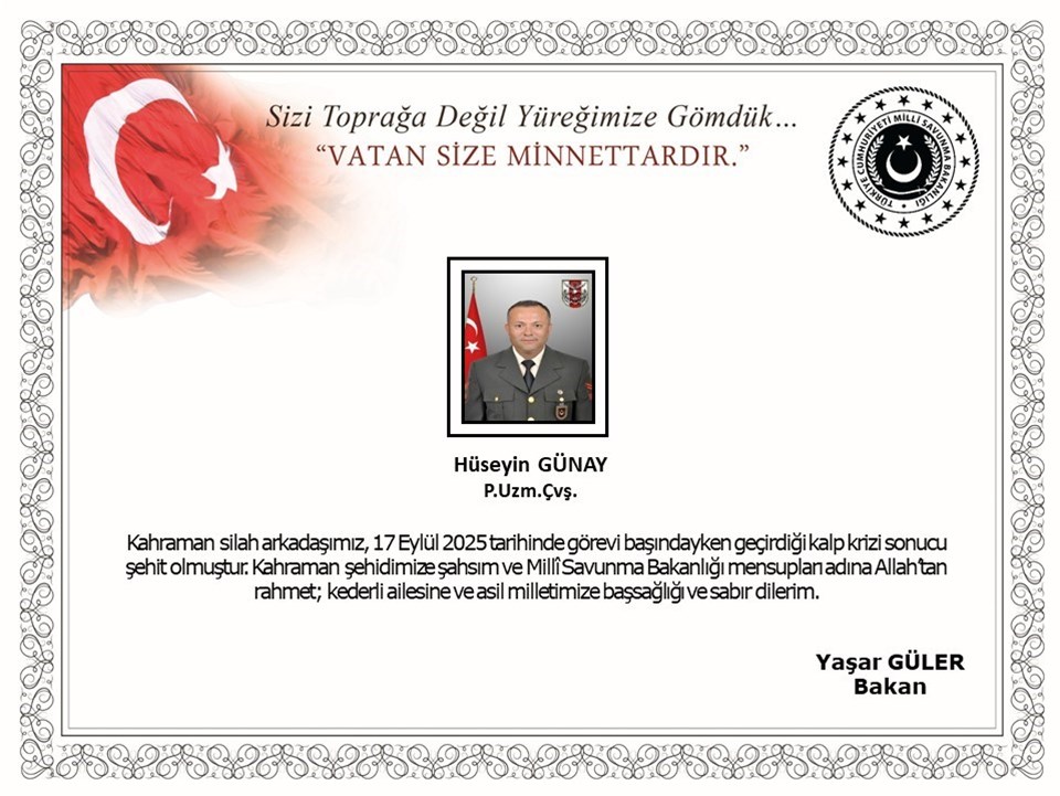 Bakanlıktan yapılan açıklamada “Kahraman silah arkadaşımız Piyade Uzman Çavuş Hüseyin Günay, 17 Eylül 2025 tarihinde görevi başındayken geçirdiği kalp krizi sonucu şehit olmuştur.” denildi.