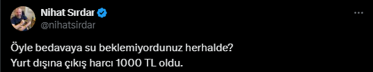 Uçaklarda suyun bedava olmasından sadece 2 gün sonra yurt dışına çıkış harcına Erdoğan’ın imzası ile zam gelmesi ünlü radyo programcısı Nihat Sırdar’ın da dikkatinden kaçmadı.